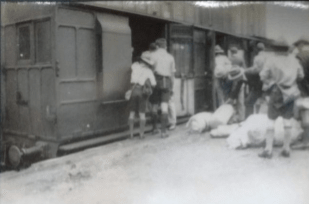 1925 5th Cambridge (Perse) unloading the train on return form camp. A horse drawn cart took the equipment to the school (see companion piece, ‘Home from the Station’, in ‘Horses)