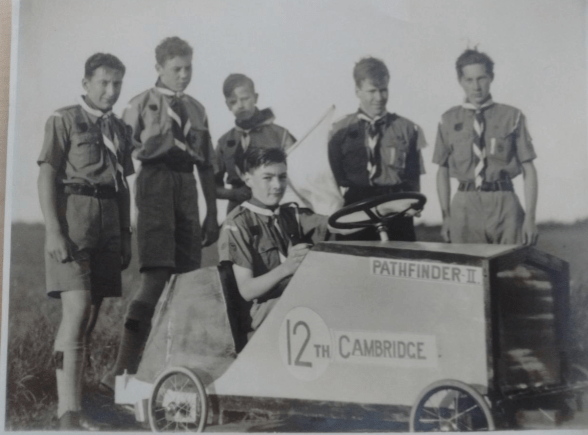 1954 5th Cambridge ‘L Sunderland of the Squirrels, aided by a team of volunteers from many patrols, designed and built a vehicle to enter the Scout Soap Box Derby: and to London it went one Saturday morning with drivers and mechanics. No victories came our way this year but a great start has been made.’