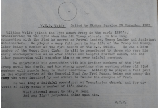 W H D Wolfe Cambridge District Scout Archive Obituary by W T Thurbon JWR Archivist Mar 2019 Share this: Click to share on X (Opens in new window) X Click to share on Facebook (Opens in new window) Facebook Like Loading...