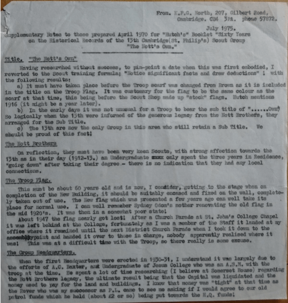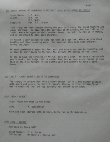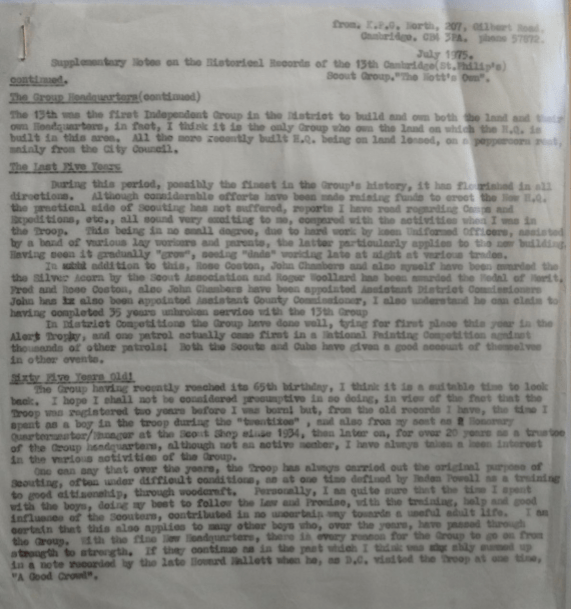 | 1970 is the 60th year of the 13th (Notts Own). The original register shows the Troop was founded 1st June, 1910 – the first Scout Master being Maurice Eastwell. A.S.Ms. were J. W. Leighton and Frank Ranner, being succeeded in 1912 by H. W. Benson of Emmanuel College and the Revd. Richard Cripps -Curate of St. Philip’s. In 1913 came the Nott Brothers (L. C. Nott and H. P. Nott) – both were killed in the 1914/1918 War – H.P. Nott 27/4/1916 – and L. C. Nott 18/4/1917, being awarded the Military Cross. A.S.M. of the 1913/14 period was H. N. Still of Christ’s College.In May 1916 the Troop was re-organised by Alan Wacey (a Master at St. Philip’s Boys’ School), with Jack Moy as Troop Leader – later acting A.S.M. The plain brown troop scarf was dropped in favour of the present grey and claret, around this period. In the middle of 1919, A. G. Hutchinson (“Hutch”) returning from war service was asked to re-start the troop. With very little knowledge-but, with enthusiastic and loyal help from Freddie Fuch, Sydney Odom, Bill Stigwood, Billy Mason and Miss Gwendoline Bryant (Girl Guide Captain) – a temporary headquarters was found in Tennis Court Road, where also were the 11th-with whom the troop became associated. During three years or so here, the troop had a very active life – part of the headquarters being available every night in the week-either “the den” or the big room upstairs. Apart from normal training activities-there was boxing instruction under Mr. Lowings – inter-troop football and cricket-and many community service efforts: – the Christmas toy collection, packing and delivery over 500 parcels for Mr. Peter Blowers. Delivery of 900 invitations poor children’s entertainment at the old “Rendezvous” for Mrs. Mason. Distribution 10,000 leaflets League of Nations Union Rally for the then Mayor (G. P. Hawkins, Esq.) In this period the troop was strengthened with the inclusion of Bernard Armstrong, Peter Le Neve Foster, Rovers Ward and Wilson – Troop Leader Billy Baker Patrol Leader Claude Palmer (the present G.S.L.) Joint camps with the 23rd (St. Matthew’s) were held at Heacharn and Dovercourt Bay-and with the 6th (Higher Grade) at Stow-Cum-0uy. A play “The Fortune Teller” was produced by Bill Stigwood, and an exhibition and sale of work for the St. George’s Day 1921 – to assist the “Vermand” Belgian Relief Fund, was presided over by Mr. E. H. Church, President of the local Scout Association. With the departure of Mr. Hutchinson from Cambridge-the troop was carried on by Sydney Odom – with J. L. Mason as A.S.M., assisted by E. C. Corks (Queens) and T. M. Cherry (Trinity). The Late 1920’s – the 1930’s – the 1940’s – the 1950’s to the Present Time 1928-1930 G.S.M. W.G.D. Clee A.S.Ms. T. F. Legge, L. Mason, P. J. Goodliffe, D. J. Oakman, W. J. Warner (St. John’s). 1930 A.S.M. George Pettitt with Sydney Odom as Honorary S.M.1931 G.S.M. R. E. Loades with A. C. Baxter (Jesus College) as A.S.M. It was during this period-thanks to previous research work by Mr. Baxter, the “Notts” legacy became available, and this was used to pay for the Marmora Road Headquarters George Pettitt and his brother Harold with other contemporaries, who formed the Rover Crew at the time, did much of the work on the original building. 1933-1935. G.S.M. and R.S.L. was R.E. Loades, with A.S.M.s Dan Gentle, Mervyn Thompson. C.M. was Miss F. Clarke, A.C.M. Miss C. E. Gresham. 1935 – 1936 G.S.M. John Covell, A.S.M. H. A. Wright. The War Period-1938/41 shows G. L. Dunn in charge of Scouts and Rovers (probably from 1938) with assistance from R. E. Loades, J. B. Bennett, and Dennis Newman. Miss F. Clarke (Mrs. Squires) was C.M. 1943 Records give “Bunny” Bennett in charge Scouts and Rovers with Arthur H. Martin (now H.Q. Field Commissioner) and Charles White as T.L.’s. Then follows a period with no certain dates-but probably prior to 1947. G.S.M. R.E. Loades, S.M. A. H. Martin, A.S.M. H. W. Pettitt, A.S.M. A. E. Starkey, C.M. Mrs. Isaacson, A.C.M. Miss D. Rose, Cub Pack Workers are also given as Mrs. Wisbey and Miss G. Cross. It is thought that Dr. “Jock” Dawson of Hadstock (now an A.D.C. for Cambridge), also assisted in running the Troop during the war. In 1948 Fred Coston became A.S.M., and S.M. a year later, with Terry Ward and John Chambers as A.S.M.’s. Mrs. Rose Coston was in charge of the Cub Pack 1950-1965, being assisted by Mrs. Day, Miss Symonds and Miss Saddington. Mrs. Day took over the Cub Pack in 1965. The extension of the Marmora Road Headquarters was opened by the Revd. Canon Sydney A. Odom, H.C.F., on May 13th, 1961 (Syd Odom is remembered affectionately as one of our hard-working early Scouters). This new part of the headquarters had already been in use for some months – much of the actual erecting, site preparation, etc., was carried out by John Chambers and his contemporaries (unrecorded hours of extreme hard labour of which few people know). Over the last 20 years, the following have assisted with the Troop:- Ralph Tabrum, Colin Chambers, Ron Milton, R. E. Collins, Brian Coleman Eric Maskell and more recently Brian Johnstone. Mr. and Mrs. Coston, John Chambers, Claude Palmer, have each been awarded The Scout Association “Medal of Merit” in recognition of outstanding services to the Scout Movement. Written and published by A.G. Hutchinson (Honorary S/L) To celebrate the Group’s Diamond Jubilee 1910-1970 And in grateful memory of the Nott Brothers Compiled from information supplied by Bill Thurborn and Ken North and from original registers |