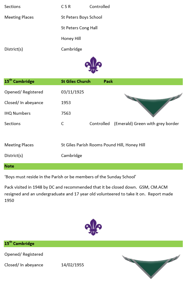 Listed as closed in 1978 County AGM. In 1980 a single reference in notes at a District event called the group the 15th Cambridge (St Philip Howard). They were active at this date having members attend events at Abington. This Catholic Church had been opened in 1978 on Cherry Hinton Road.