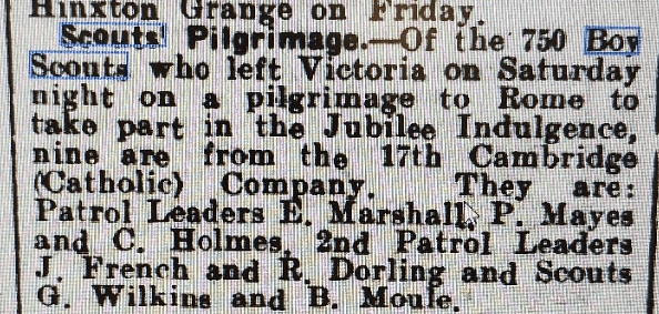He led nine Scouts from the 17th on the International Holy Year Pilgrimage to Rome. Six hundred attended this rally and it was counted as the highlight of the troop’s history. On return the flag was paraded in Our Lady and the English Martyrs. During this time numbers rose to 40.