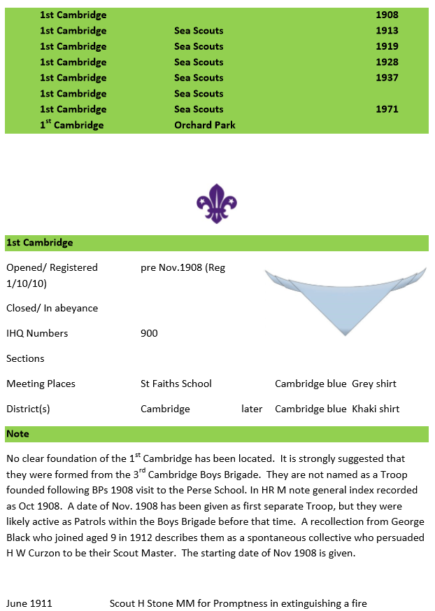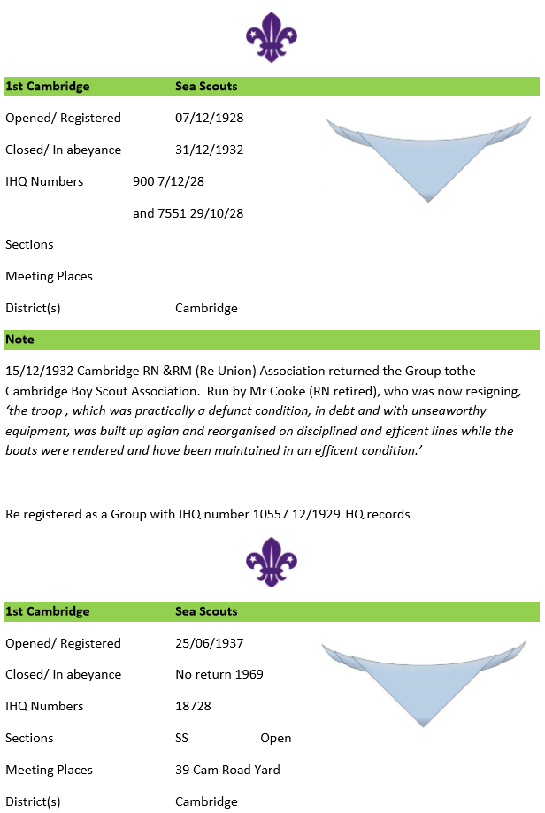 A new group took the name 1st Cambridge (Orchard Park) in 2009. In no way connected with Sea Scouts it is based on the new area of Cambridge to the north.