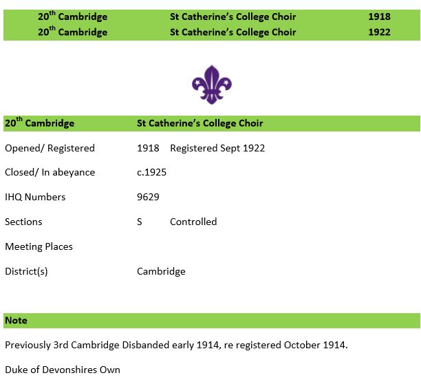 A number of uncut 20th name tags are in the 5th Cambridge (Perse School) Archives. They give no more than ’20th Cambridge’. They are very likely associated with Bob Eden once of the 5th who, with D Loades, ran an ‘experimental ‘District Senior Scout Troop.