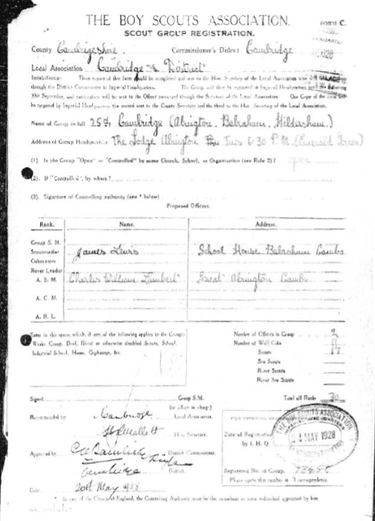 They met at ‘The Lodge’, Abington, a large house with several outbuildings. The first GSL/ SL lived at the Lodge, but his initial given address was in Babraham. No clear link between the leaders and the shooting skills of the troop has been established but Abington had an established shooting club. See Activities/ Sports/ Scout Marksmanship