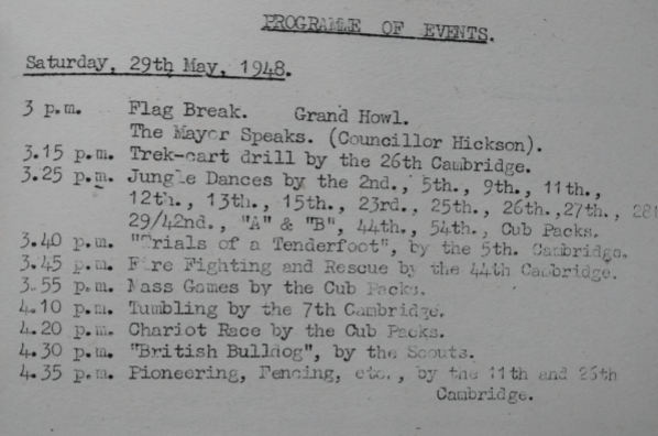Relatively little remains of this event. In this post war period resources were limited; no grand souvenir programmes or photographs. Held over two days it was a very visible event in the centre of town and reflecting traditional Scout activities.
