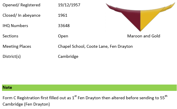 The Wolf Cub Pack at this time was led by Miss Beryl Tabbit and she was finding it difficult to find a permanent home and the offer of one by the 12th Cambridge was probably just what she wanted. The 55th Cambridge therefore amalgamated with and/or was absorbed by the 12th and ceased to exist as a separate Cub Pack on 17th September 1943. This coincided with my 11th birthday and I joined the County School Scouts (7th Cambridge). I am not aware that the 55th Scout Troop was in existence at this time or indeed when it closed.