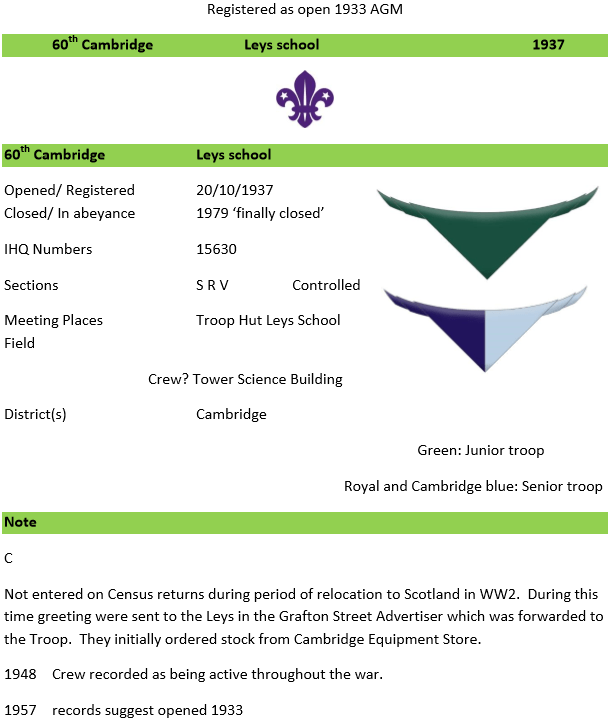 It is clear from Leys School archives that the Scout Troop was started in September 1933. They had built their own Scout HQ by 1934 which was opened by Lord Hampton. The District records do not house details of the first registration.