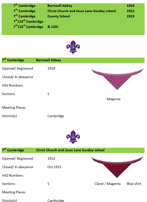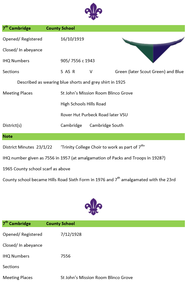 The Old Cantabrigian Society records the County School Troop (below) as starting in 1915 and gives details of war time activities. The original scarf is described as yellow and purple.