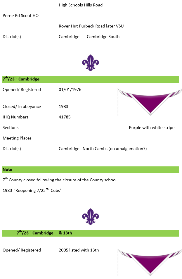 1976 A notice in the July Cambridge Scout Gazette recorded that the 7th and 23rd were working together for three months, possibly amalgamating on the 1st January 1976.