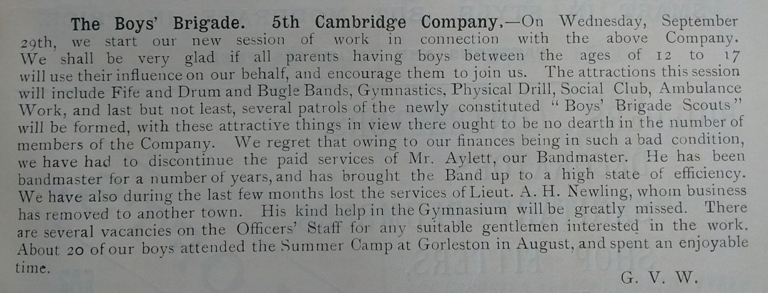 St Andrew the Less hosted the 5th Cambridge Boys Brigade Company under Capt. E O Brown, who was later to become a member of the District Committee as a BB representative, and later without that designation.