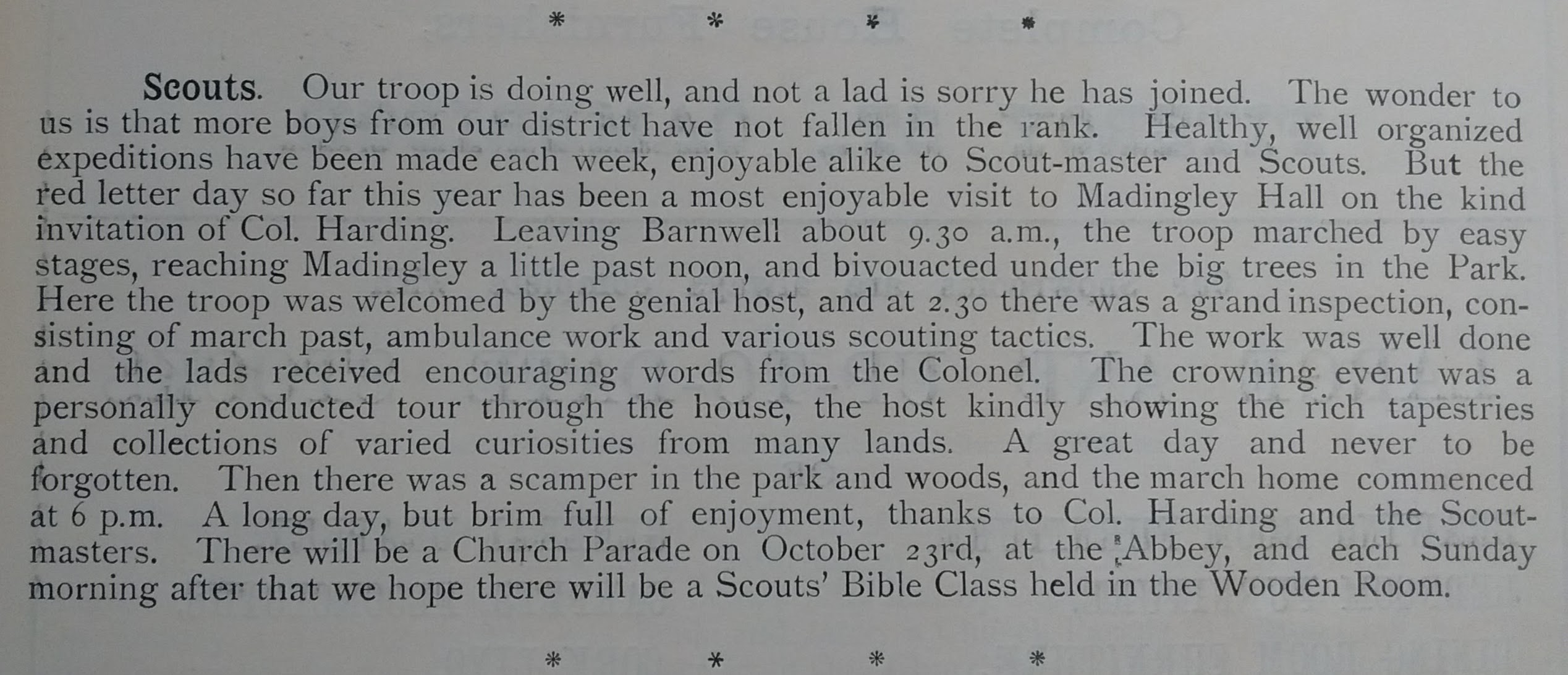 The available Parish magazines stop at this point. At some point before 1912 the 7th had become the ‘Christ Church and Jesus Lane Sunday School’ Troop. Christ Church, St Andrew the Less is the full title of the Church; Abbey Church is the older church out of town but also on Newmarket Road. It is not known if this was just a name change (as could readily happen when the forms for registration were completed each year) or the joining of JLSS generated the change.