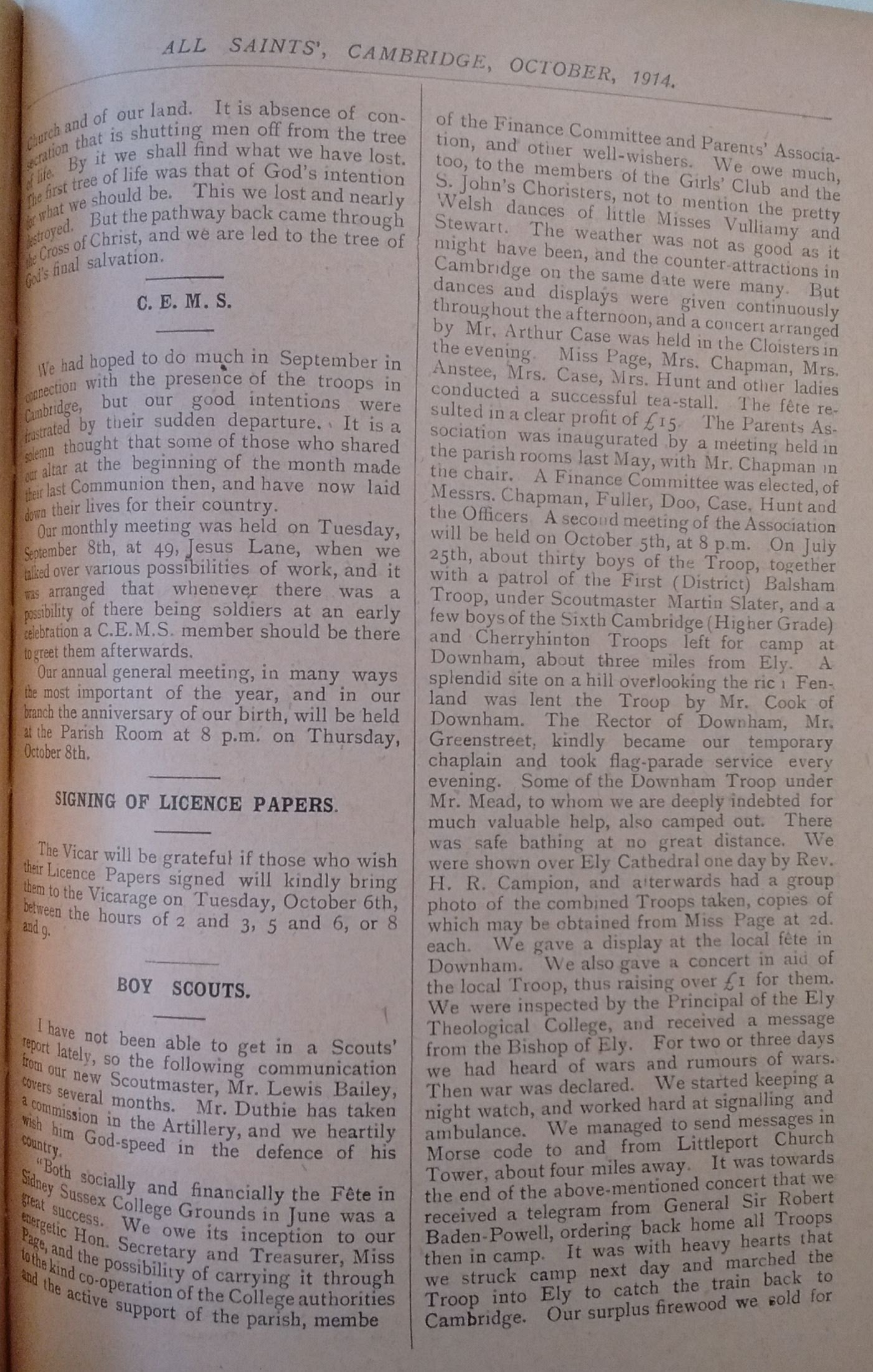The Troop appear to have closed between July and September 1916, possibly the long University break. Dean of Queens’ (CT Wood, later DC and CC) was looking after the troop by November 1916 in Hattersley’s absence. The Troop may have closed at some point, the next reports we have are 1920 and the Troop had been renamed first All Saints with St Philip’s and by 1920 All Saints with St Andrew’s.