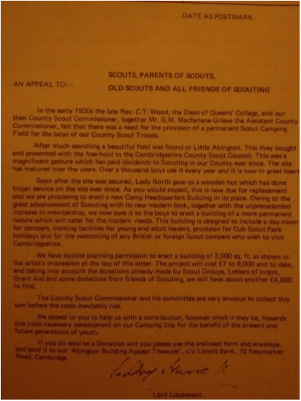 1984 County debates on the site identified ‘many issues’. It was not intended to close the site and the request was for an objective discussion. Further open debates were held in 1985, Brian Payne CC asked the Districts to discuss the future of the site. The site was funded in part by HQ grants, County Council grants and the fencing funded by an anonymous gift. The County discussed the site in October 1985 where it was decided that the site would be kept. The working party comprised the eight DC’s or their representatives. At the meeting it was observed that the site covered day by day costs by camping fees but that to cover longer term maintenance costs there was a need for Capital from outside the movement. A proposal to raise camp fees to 50p/ head/ night was rejected and 20p was felt to be more ‘realistic (for Scouts to pay). Around 1986 an ongoing concern was the state of the toilet block. It was suggested that Harry Thompsons legacy (c £2000/ District) be collectively used to update the buildings. In 1989 there are again ‘rumours and discussion’ mentioned in Cambridge North Chronicle.