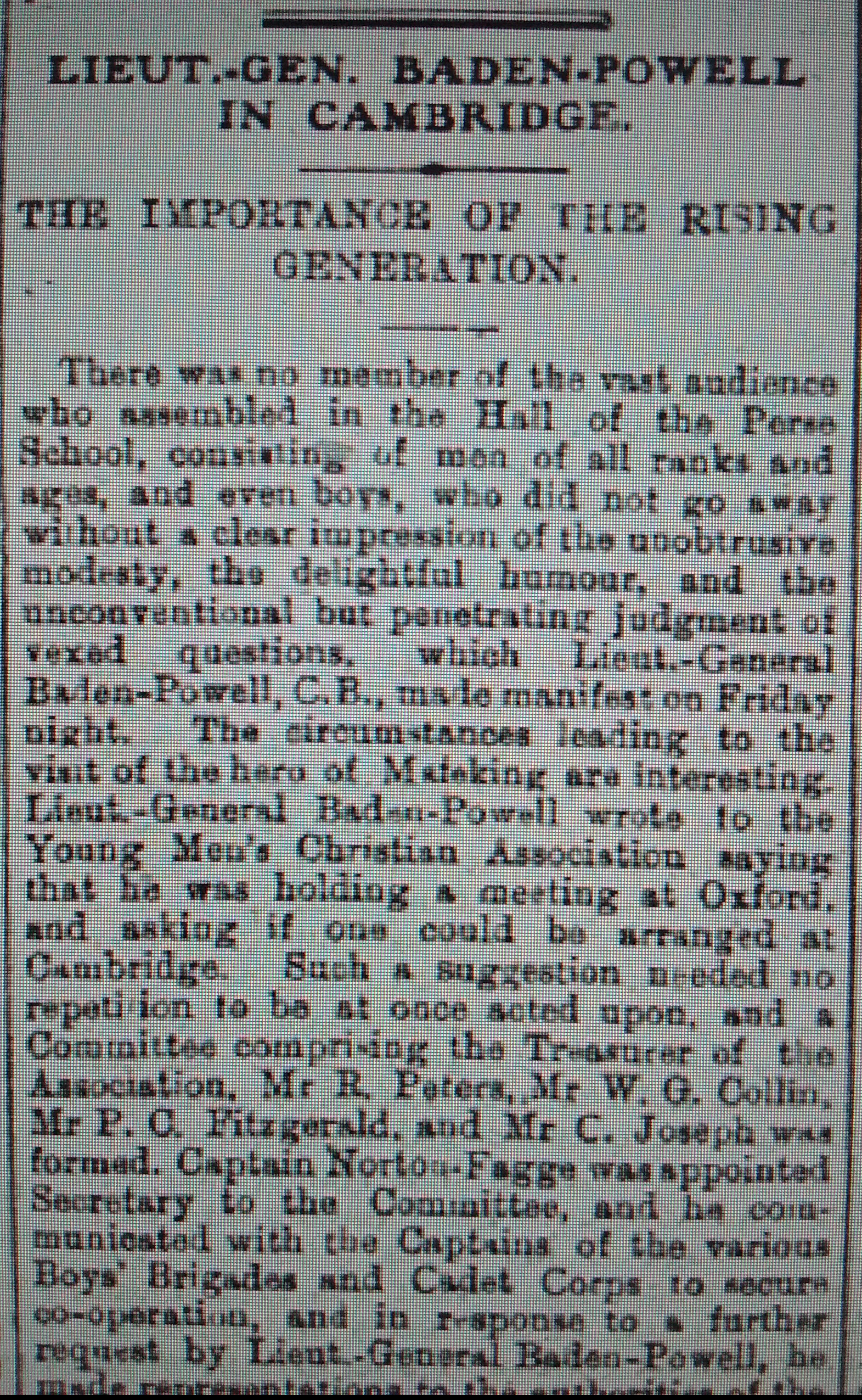 The report below clarifies the meeting as one event, organised by the YMCA held at the Perse. Some reports lack this clarity and cumulatively suggest a YMCA then a Perse meeting. The presence by invitation of the Boys Brigade is noteworthy, as is the that of the Cadet Corps, who did not appear to have developed Troops within their organisations.