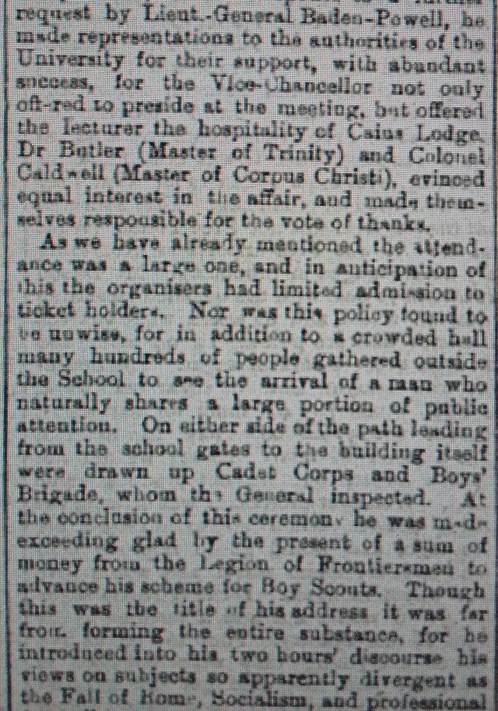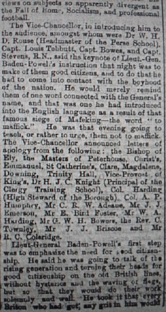 1908 Lieut.-General R.S. Baden-Powell, the famous defender of Mafeking, propounded his ‘fad’ – peace scouting for boys as a means of instruction in good citizenship – before a large audience at the Perse School Hall. The Vice Chancellor gave apologies from the Bishop of Ely and various college Masters, all of whom were most heartily in sympathy with the objects of the meeting. 08 02 22