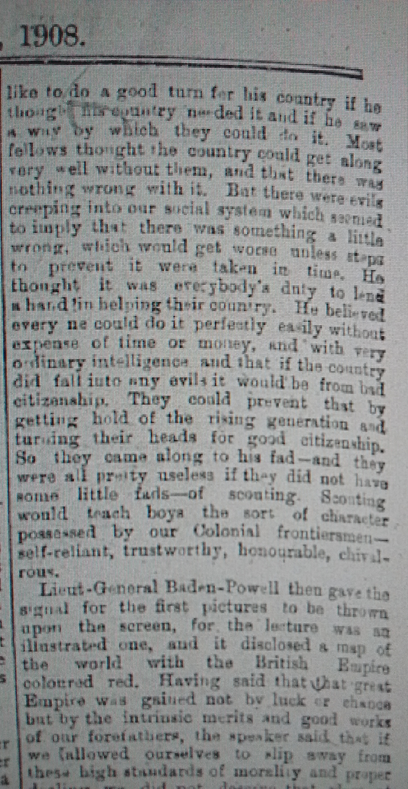 1908 Following Lieut.-General Baden-Powell’s recent visit, a meeting was held to consider forming a branch of the scheme of boy-scouts, perhaps as a development of the present Boys’ Brigade. But Capt Norton-Fagge thought there were a large number of boys not eligible for the Boys’ or Church Lads’ Brigades who would be just the lads for this scheme. A number of men might take three boys each and teach them a few of the elementary principles. 08 03 06c
