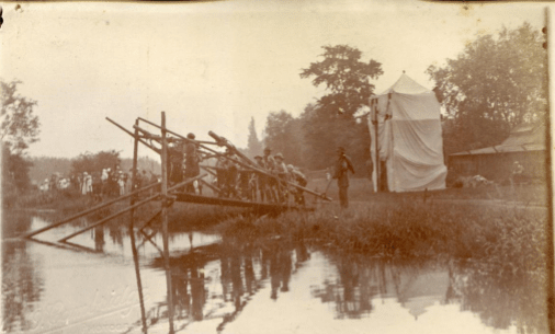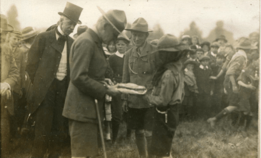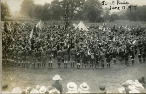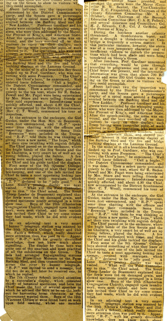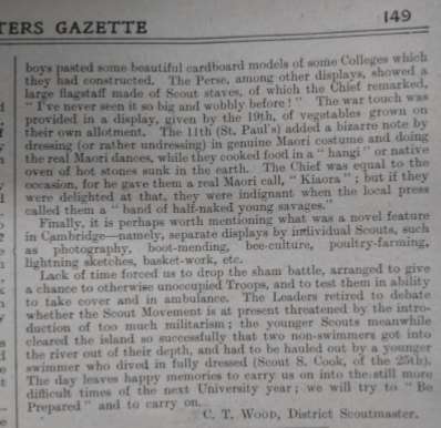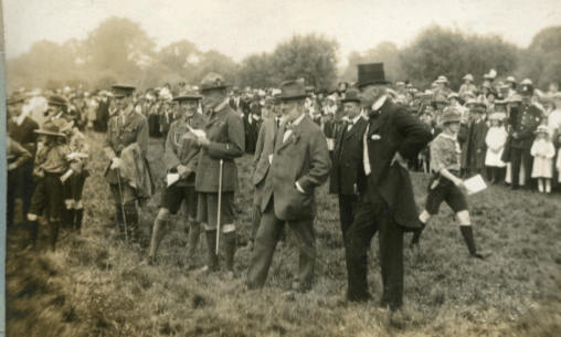 The Chief Scout’s Visit for our Rally of June 13, 1917, still stands out in our memories as a red-letter-day. A German bomb dropped on the front of his train in Liverpool Street Station; but in spite of it all, B.P. arrived serene and smiling, though three hours late. Many had told us that it was hopeless to expect the Troops to give a decent show in war-time; but they did, -especially the 10th and 21st with their Telegraphy, the 5th with their Camp-pole of Scout-staves, the 11th with their Zulu war-dances and camp oven, the 8th and 9th with their double lock-trestle bridge, the 13th with their burning house, and the 1st with their shipwreck. How the crowd swarmed over us on Sheep’s Green! and how we cheered the Chief after his speech at the P.L’s. Conference in the evening!Reveille