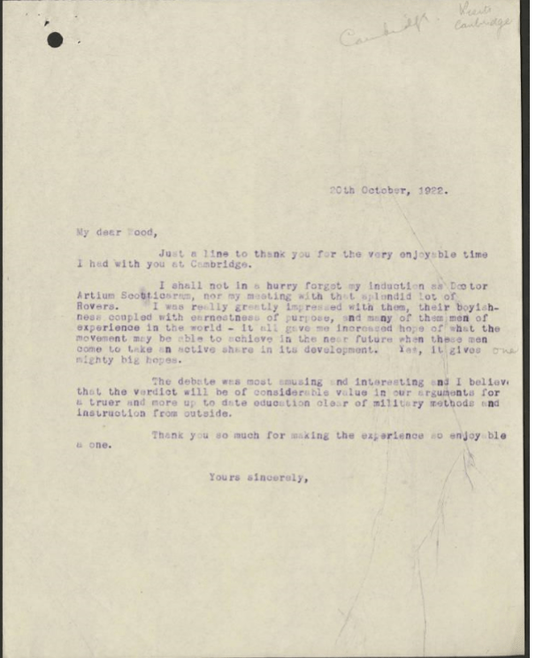 1922 The Chief Scout, Lieut.-General Sir R.S.S. Baden-Powell is on a visit to Cambridge and yesterday witnessed a Scout rally by the Cambridge & District Boys Scouts in Queens’ College Grove. On entering the Grove the Chief was surrounded by Scouts, who had been in ambush. They cried his Zulu name as they gathered around him and then sang him a chorus of welcome called “Ingonyama”. Translated the worlds sung mean “He is a lion. He is a lion. He is greater than a lion. He is an hippopotamus c22 06 27 Mike Petty