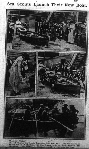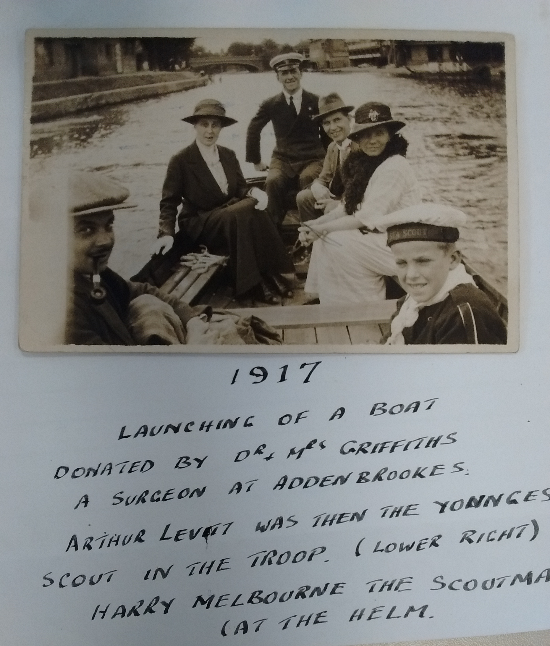 The 1st Cambridge formed in 1908 became Sea Scouts in 1913. A boat called the Ripple is recalled by George Black who joined in 1912. The crew was known as the Cripples. On 6th June 1913 they launched their new boat named ‘The Albert’ (a cutter) built of pine and elm with six oars and a mast, capable of carrying 10 boys. They purchased the Alert for £50 (with mast and sail) and having been delivered by train was dragged from the station with the band leading the way. It was launched by Mrs Howard Marsh (see below). Another boat was donated in 1917 by Dr and Mrs. Griffith. In 1921 they launched The Sentinel. In the 1920’s two boats were kept under the Scout hut.