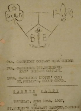 1937 The invitation to the 1937 Garden Party mixed the Girl Guides, Boys Brigade and 13th Boy Scouts. They were all associated with St Philips Church. Later that year the 13th Cambridge joined the Boys Brigade to entertain ‘old people’ at Tracy memorial Hall. This was repeated the following year with the Girl Guides joining the occasion. These events were described as unique (for the District or County?) by Mrs de Beaumont, GG Commissioner.