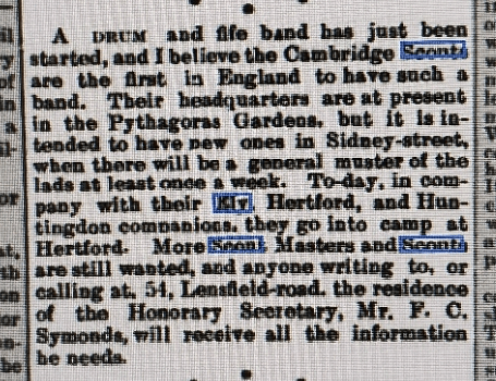 A history of the 1st Cambridge band is the troop magazine the Fleur-de-Lis of 1912. See under Local History/ Communications/ Scout Newsletters/ Fleur-de-Lis, and the photo below.