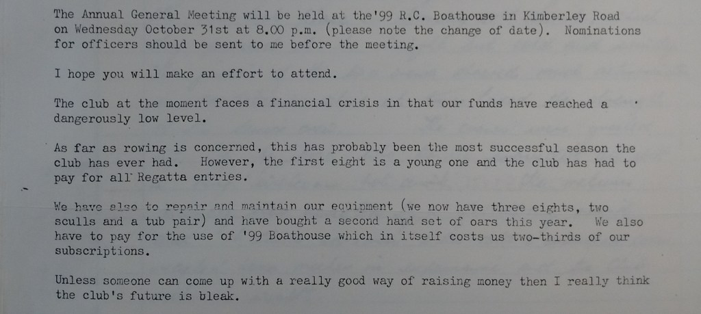 1979 From 1974 it slipped down the rankings until in 1979 it only managed one boat in the bumps and that came 16th. The boats were destroyed in an arson attack in July 1975 and money was even tighter. The club finances relied on ‘Vice Presidents’ and Non rowing members who between them contributed 67% of the income. The club eventually ran out of members. No further racing is recorded.