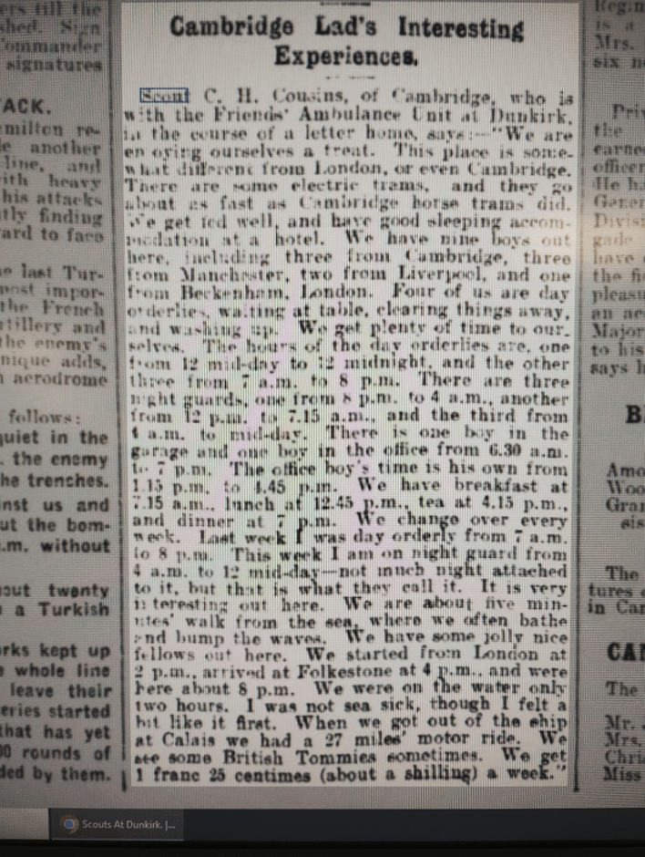 These five Cambridge District Scouts from the 6th (Higher Grade School), 8th (All Saints) and 12th (Milton Road/ Viscountess of Clifden’s Own) were enrolled as hospital orderlies at the Red Cross Hospital in Dunkirk. The presentation of the news did not make it clear that this was not a District Scout initiative.