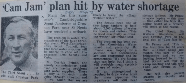 The first CamJam was in 1978 at Croxton Park, courtesy of Lady Fox when Derrick Prince was CC. The Chief Scout William Gladstone visited on this occasion.