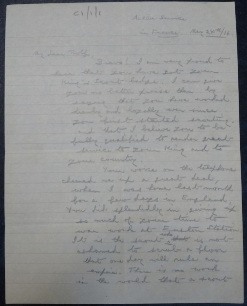 On May 24th 1916 Captain Roland Philipps, the Scout Commissioner for Preparatory schools wrote to P/L H R Gardiner, Kings Scout, at West Down School.