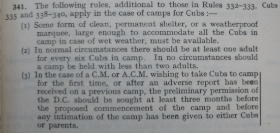 Following the Conference of ACCs (Cubs) and Akela Leaders in June 1946 ’It was recommended that no Cub under the age of ten years should be allowed to camp’. Changes to POR in The Scouter May 1948 stated ‘No Cub under 9½ may be taken to camp except with the specific permission of the DC’. It also required ‘a clean permanent shelter or marquee as backup for bad weather’. The reasons for these moves were not given.
