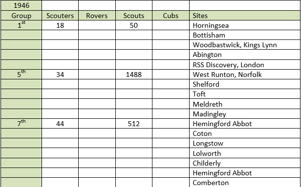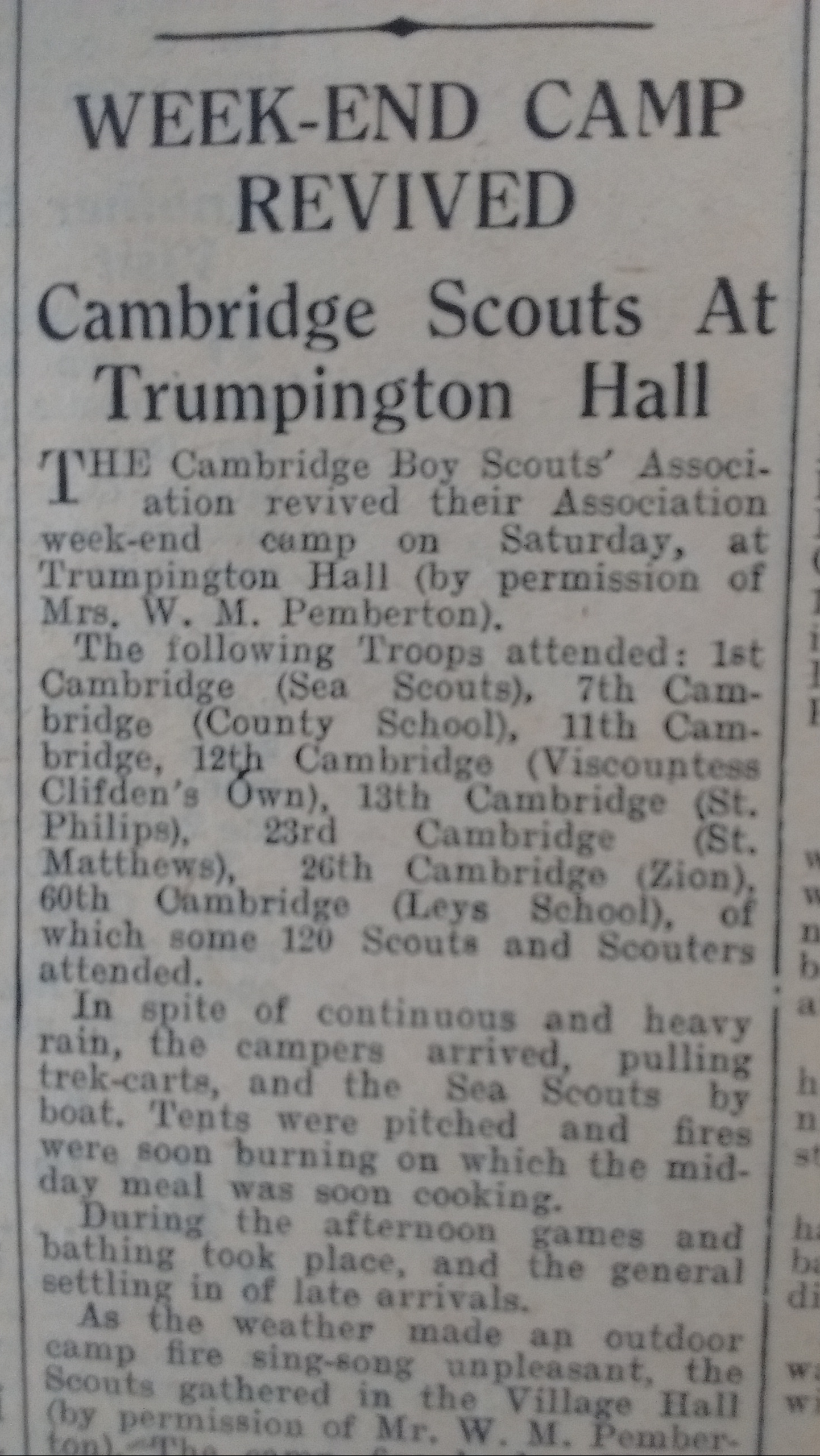 Immediately after WW2 a District camp was revived at Trumpington Hall, another example of the long term generosity of the Pemberton family.