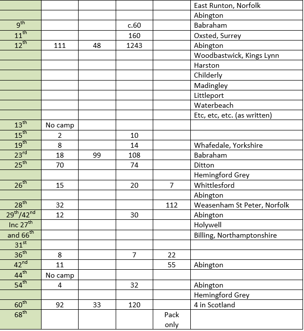 The 48 named camps used 29 campsites. Eight were used more than once, Abington seven times. Thirteen were out of the County, four in Scotland (60th Cambridge, The Leys, were evacuated to Scotland) five in Norfolk.