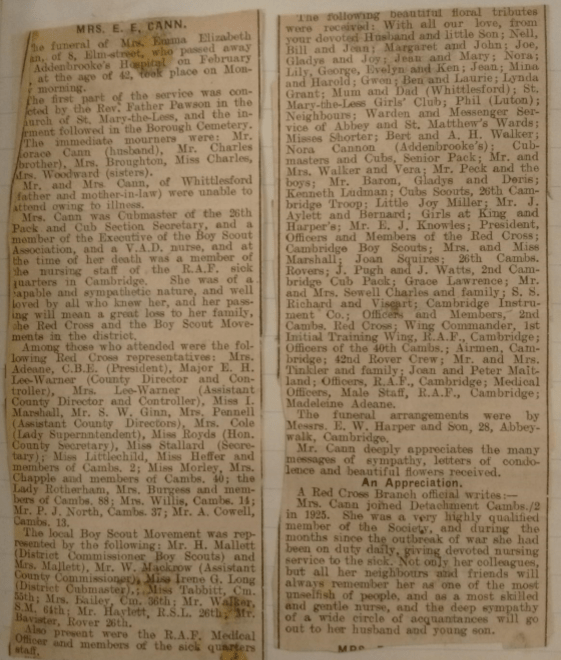 Mrs E E Cann was Lady Cubmaster of the 26th Cambridge and a member of the District Executive committee. In 1945 her name was put forward as being a casualty of war in the national scout gathering of information. Her fatal illness was, it was stated, was a direct result of working in the casualty ward. She was not registered on the Rolls of Honour.