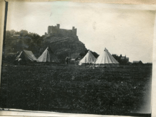 The view at Chatsworth House may well warrant recording, and bucolic scenes reminiscent of Constable are captured on film. The less picturesque are recalled more for the incidents on camp, as at Fortheringhay (header picture) where the weather and later the ‘flu’ epidemic dominated recollections.
