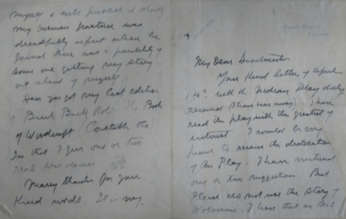 Yours kind letter of April 14th with the Indian Play duly received (I have been away). I have read the play with the greatest of interest. I would be very proud to receive the dedication of the play. I have ventured one or two suggestions. But please do not use the story of Wolverine. I have …. in this myself will publish it shortly. My business partner was dreadfully upset when he found there was a possibility of some one getting my story out ahead of myself.