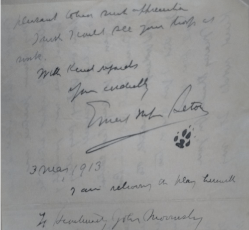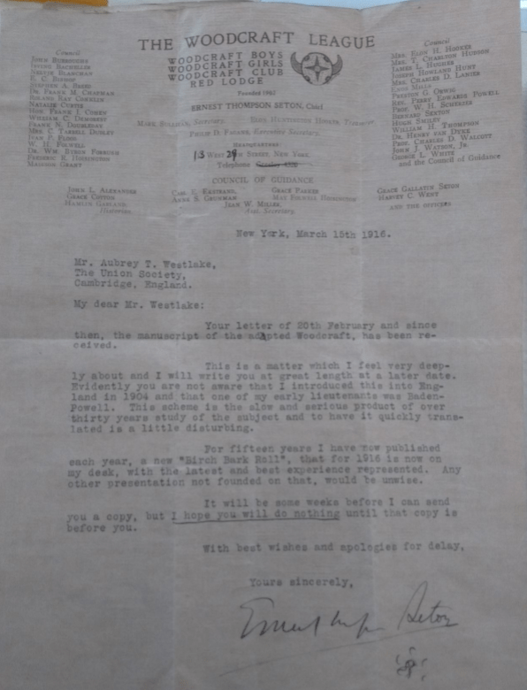 In 1913 the founder of the 12th Cambridge John Morrish, later Murrish, wrote to Ernest when he was visiting Britain. The reply (below) exists in the Cambridgeshire Collection. Aubrey Westlake was influenced by his ideas in 1915 when, as a student in Cambridge, he planned the Order of Woodcraft Chivalry. He was introduced to Seton’s ideas by Murrish.