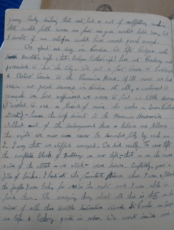 ‘We spent one day in London. We left Rodger with Harold’s wife here at Reading and proceeded to ‘do’ the city. We got a fast train to Paddington + Metro train to the Mansion House. Until now we had seen no great damage in London at all, + continued to remark on how surprised we were to find so little damage (I wished to see a friend of mine who works in Queen Victoria Street) –hence the trip direct to the Mansion House – we walked out of the underground there and believe me fellows the sight we saw can never be described fully by such as I. I say that we stopped amazed. We did really. To the left the complete block of buildings on our left, – that is on the same side of the street as we stood – were down. Completely, just a pile of bricks. I’d not the faintest idea where I was and fortunately the people I was looking for were to the right and I was able to find them. The amazing thing about all this is that in the middle of this complete destruction stands St Pauls as large as life and looking quite in order. We went inside and I got the impression that although two bombs have fallen inside it will want a great many more before any great difference is made.’
