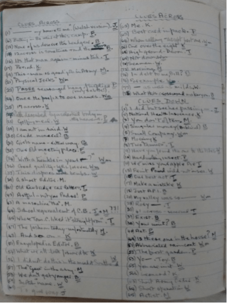 The response to the first small grid (above) suggests that most of the correspondents did not regularly complete crosswords. As a consequence each question in this crossword has been targeted at individual correspondents as indicated by the initials at the end of the clues. Some require answers that are totally dependent on knowing the individual or the group history. 1A is seemingly an in-joke between at least two of the correspondents and refers to the 1939 camp at Brynbac.