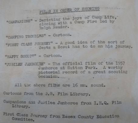 The following are the records of named films shown and produced in Cambridge. Records of other showings exist but not Scout specific films (as 1950 below).