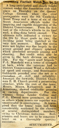 1921 DC proposed an inter Troop football league to keep older Scouts interested, the Patrol Leaders Council considered it unworkable. The Scouter Column in the Cambridge Chronicle observed that both Football and Cricket leagues had not worked well in the District.