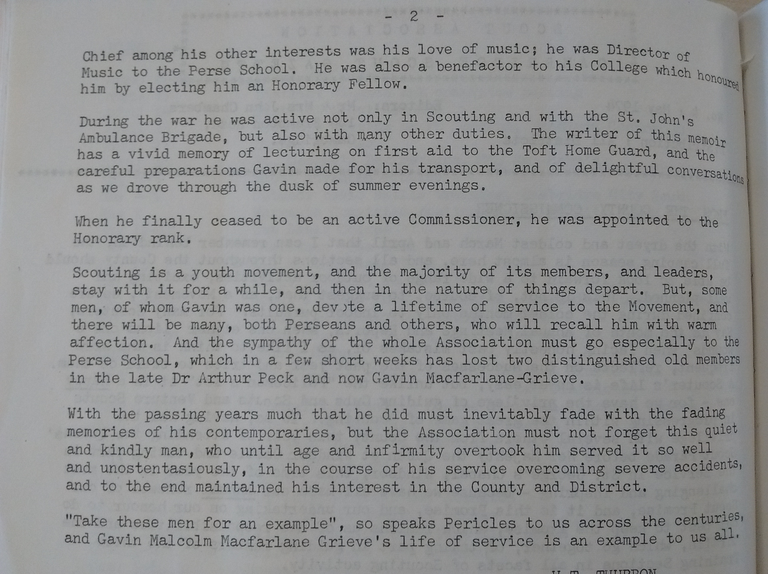 Gavin Malcolm Macfarlane Grieve was a pupil and teacher at the Perse school and lived for most of his life at Toft Manor, sometimes described as the squire. Generally known as Mac, or Uncle Mac (largely within the Perse) he was central to Perse Scouting (5th Cambridge) for many years and was ASM from 1912 and SM from 1918 on his return from serving in the Black Watch during the Great War. He was known to be active as an SM 1944 – 1948 in an era when many leaders were stepping away from direct involvement at his age.