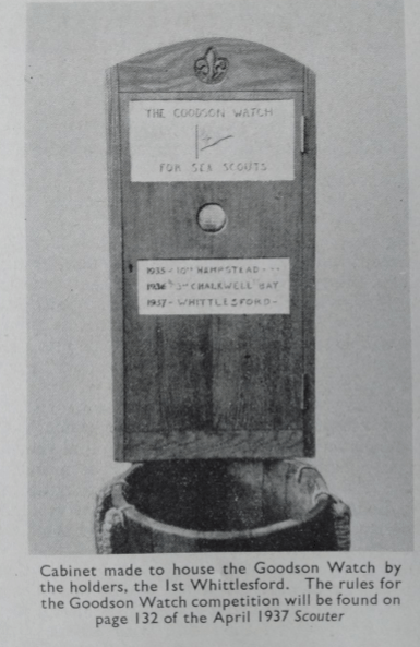 Originally called The Goodson Watch, the competition was set up by the Chief Scout following the presentation of a commemorative watch to the Sea Scouts by Miss Goodson, in memory of her brother Captain Peter Goodson Mercantile Marine. The watch to be awarded to the Group sending in the best log of a journey by water or by land and water performed by Sea Scouts. The watch was awarded each year from 1935 to 1938. In 1938 the 1st Nottingham Sea Scout Group won.