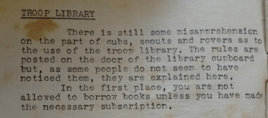 1926 7th Cambridge ‘That the Troop ha a Library of Scouting books.’ This was later changed to only Scouting books. Some were donated by leaders, a librarian was elected, P/Ls took responsibility for ther Patrols and fines of 1d for a week late and 2d for each week thereafter was agreed.