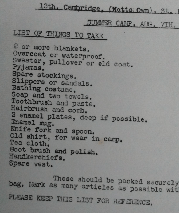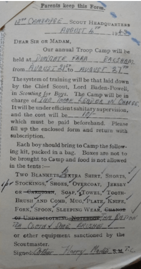 1939 13th Cambridge Request to bring ‘Writing paper and P. C.’s’ to the 9 day summer camp. P. C.s are blank post cards whose postage was half that of a letter. It was also a requirement that the boys hair be cut in advance of the camp.