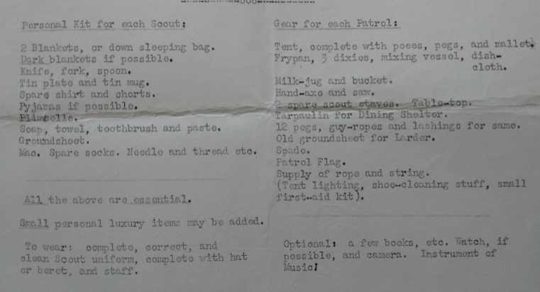 c 1945 ‘Needle and Thread’, ‘small personal luxury items may be added’ and a Patrol ‘Gear list’. The Optional list suggests that a watch was not usual. A static camp. Note that whilst undated the ‘Scout Hat or beret’ suggests a slightly later date. The ‘2 spare scout staves’ under Patrol gear implies that a personal staff was part of uniform.