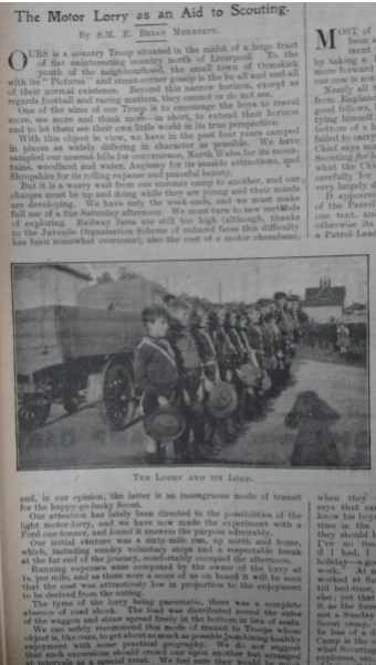 Motor vehicles have been around longer than Scouting but the earliest recorded use in Cambridge was 1913. The great expansion in availability and knowledge was during and after the Great War. The cost of motors was probably only viable for week long camps that were further than could be reached by Trek cart but not so far that the inconvenient railways, with several trans-shipments, became the cheaper option.