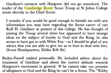 The Kindred had some roots in Cambridge with H Rolf Gardiner, editor of ‘Youth’, a magazine that acted as a centre of thought for the movement. He was at University four years after the foundation of the Order of Woodcraft Chivalry and involved in both OWC and Kindred of the Kibbo Kift. Like Aubrey Westlake he was a Scout, he founded a troop in his school and was active for seven years before stepping away from active involvement. It is likely that he stopped scouting before coming to Cambridge.