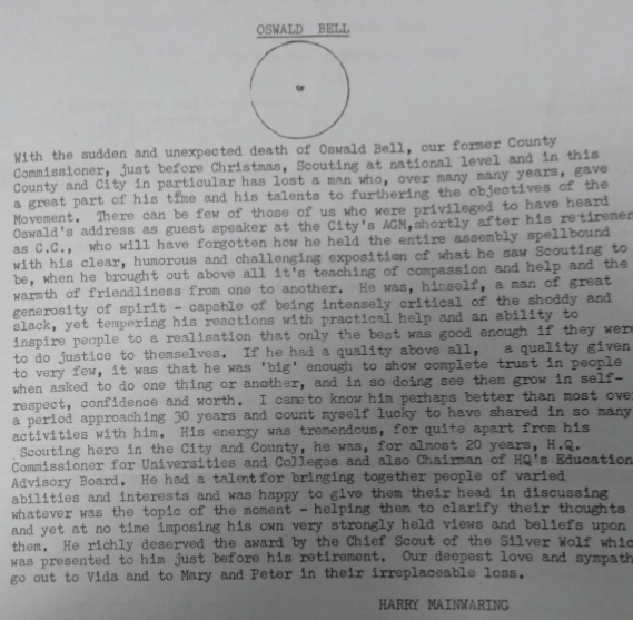 Oswald Bell was ‘an Expert Educationalist’ being the first Director of the Cambridge Institute of Education, a post he held for 20 years. As noted in his obituary above he was HQ Commissioner for Universities and Colleges for 20 years and chair of the HQ Education Advisory Board. He was chair of the European Commission of Cooperation and Co-Education of the World Bureau of Scouts and Guides.
