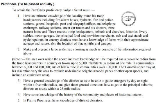Pathfinder was a badge which in its composition reflected the largely urban base of Scouting. The 1919 requirements, below, place the urban requirements ahead of the rural; and this version is from a Canadian POR.